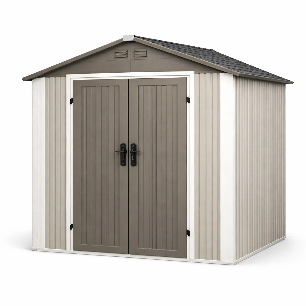 La caseta de jardín está fabricada con polipropileno resistente a la intemperie, garantizando durabilidad en diversas condiciones climáticas. Sus dimensiones son de 213 cm de largo, 130 cm de ancho y 185 cm de alto. El diseño incluye ventilación integrada para mejorar la circulación del aire. Las puertas dobles están equipadas con cerraduras para seguridad adicional. Disponible en colores Gris y Beige.