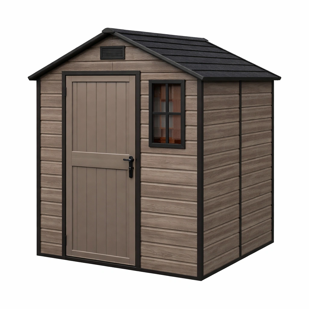 El cobertizo está fabricado en resina de polipropileno, resistente a la intemperie y a los rayos UV. Sus dimensiones son de 184 cm de longitud, 111 cm de anchura y 226 cm de altura. El color es una combinación de Marrón y Beige. Tiene un peso total de 36 kg.