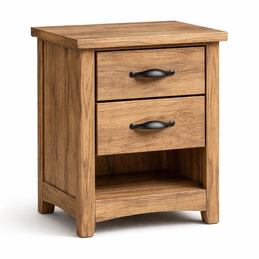 Dos cajones con asas metálicas y un estante inferior abierto.